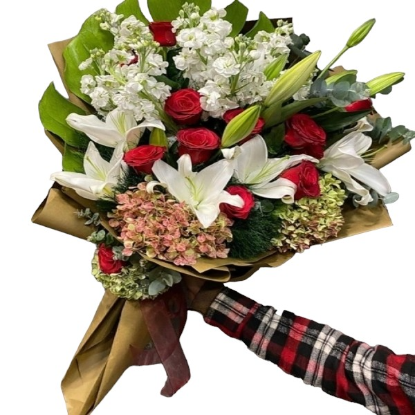 Produktcode: Kmr4911 rote Rosen, 9 Mauerblümchen, 3 Lilienzweige Zubereitet mit 3 Hortensien und Grünpflanzen.